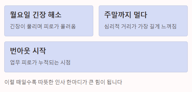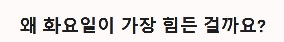 화요일은 심리적으로 '번아웃'이 오기 쉬운 시점입니다. 월요일은 긴장감으로 버티지만, 화요일은 그 긴장이 풀리면서 피로가 한꺼번에 몰려오기 쉽기 때문입니다.
