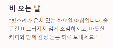 | 비 오는 날 | "빗소리가 운치 있는 화요일 아침입니다. 출근길 미끄러지지 않게 조심하시고, 따뜻한 커피 한 잔과 함께 감성 돋는 하루 보내세요." | 운치, 안전, 감성 |