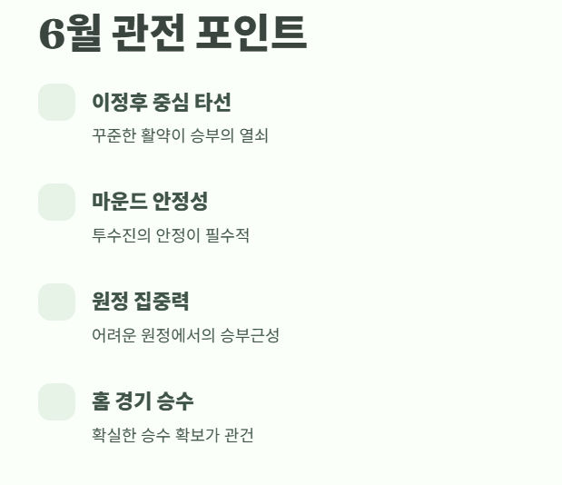 자이언츠가 이 치열한 6월을 성공적으로 보내기 위해서는 이정후 선수를 중심으로 한 타선의 꾸준한 활약과 마운드의 안정이 필수적입니다. 특히 원정 경기에서의 집중력과 홈 경기에서의 확실한 승수 확보가 순위 경쟁의 열쇠가 될 것입니다.