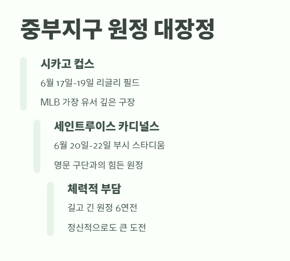 - 6월 17일 (화) ~ 6월 19일 (목): @ 시카고 컵스 (원정 3연전, 리글리 필드)