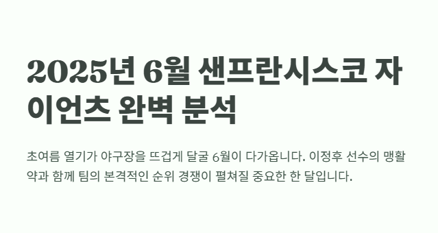 야구팬 여러분, 6월 한 달 동안 펼쳐질 샌프란시스코 자이언츠의 뜨거운 여정에 많은 관심과 응원 부탁드립니다! 이정후 선수가 펼쳐 보일 멋진 플레이와 팀의 승리를 함께 기원합시다!