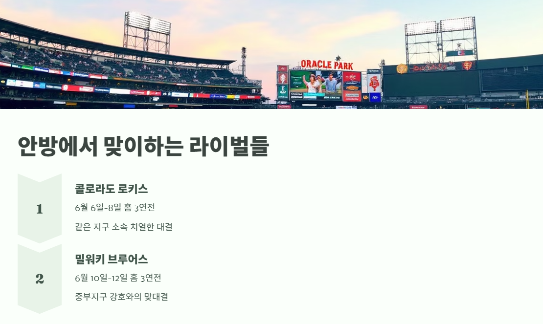 - 힘겨운 원정을 마치고 오라클 파크로 돌아온 자이언츠는 샌디에고 파드리스를 만납니다. 파드리스 역시 강력한 전력을 갖춘 지구 라이벌로, 매 경기 치열한 접전이 예상됩니다. 홈에서 반드시 승리하며 분위기를 반전시켜야 합니다. (김하성 선수가 만약 파드리스에 잔류한다면 또 다른 코리안 더비가 성사될 수도 있습니다!)