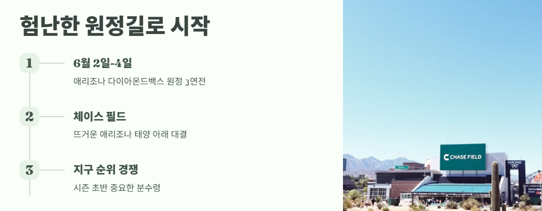 - 6월의 문을 여는 첫 시리즈는 같은 내셔널리그 서부지구 소속의 애리조나 다이아몬드백스와의 원정 3연전입니다. 뜨거운 애리조나의 태양 아래 체이스 필드에서 펼쳐지는 이 대결은 시즌 초반 지구 순위 경쟁의 중요한 분수령이 될 수 있습니다. 까다로운 상대인 만큼, 원정에서 위닝 시리즈를 확보한다면 기분 좋은 6월의 출발을 알릴 수 있을 것입니다.
