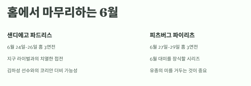 - 6월의 대미를 장식할 시리즈는 피츠버그 파이리츠와의 홈 3연전입니다. 한 달 동안의 여정을 잘 마무리하고 7월을 기약하기 위해서라도 유종의 미를 거두는 것이 중요합니다.