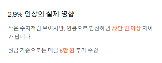 작년과 비교했을 때 내 월급이 실제로 얼마나 오르는지 한눈에 비교해 보세요. 2.9%라는 수치가 작아 보일 수 있지만, 1년 치 연봉으로 따지면 무시할 수 없는 차이입니다.