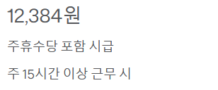 - 주휴수당 포함 시급: 약 12,384원 (주 15시간 이상 근무 시)