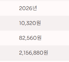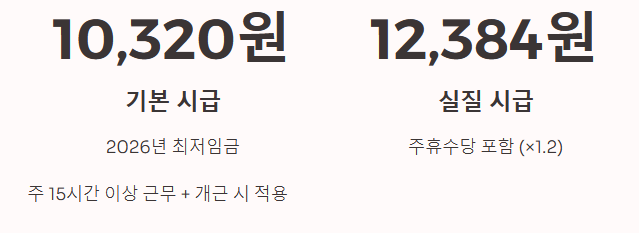 - 2026년 시급: 10,320원 (주휴 포함 실질 시급 약 12,384원)