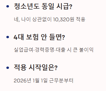 Q4. 청소년도 똑같이 받나요? 네, 청소년(미성년자) 알바생도 성인과 동일하게 10,320원의 최저시급을 적용받습니다. 나이가 어리다는 이유로 적게 주는 것은 명백한 위법입니다.