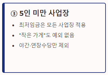 ③ 5인 미만 사업장 적용 최저임금은 사업장 규모와 관계없이 모든 사업장에 적용됩니다. "우리는 작은 가게라 적게 줘도 된다"는 말은 성립하지 않습니다. 단, 야간/연장 수당(1.5배)은 5인 미만 사업장에 적용되지 않으니 구분해서 알아두세요.