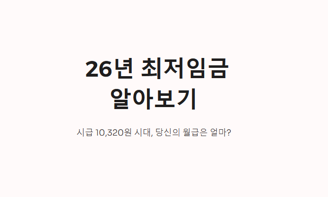 2026년 최저시급이 10,320원으로 최종 결정되었습니다. 이는 2025년 대비 290원(2.9%) 인상된 금액으로, 이제는 명실상부한 '시급 만 원 시대'가 정착되었습니다. 단순히 시급만 오른 것이 아니라, 이를 기반으로 산정되는 월급, 연봉, 주휴수당, 퇴직금 등 모든 급여 기준이 달라지게 됩니다. 이번 글에서는 26년 최저시급을 기준으로 내가 받게 될 실제 급여와 놓치기 쉬운 적용 기준들을 깔끔하게 정리해 드립니다.