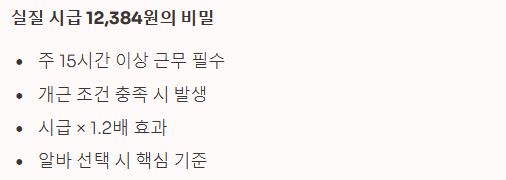 즉, 주 15시간 이상 근무하면서 개근한다면, 내가 1시간 일할 때마다 실제로는 약 12,384원의 가치를 인정받는 셈입니다.