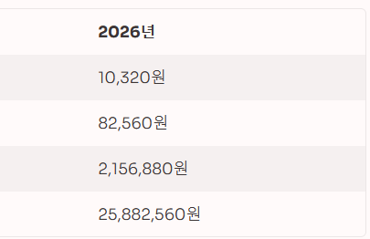 가장 중요한 숫자들만 먼저 확인해 보겠습니다. 2026년 1월 1일부터 적용되는 확정 금액입니다.