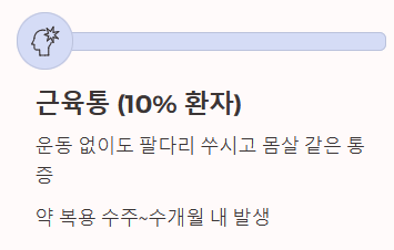 - 가장 흔한 증상: 근육통, 무력감 (전체 복용자의 약 10~15% 내외 호소)