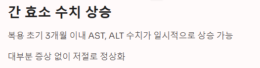 - 간 독성: 일시적 간 수치 상승이 있을 수 있으나 대부분 회복됨