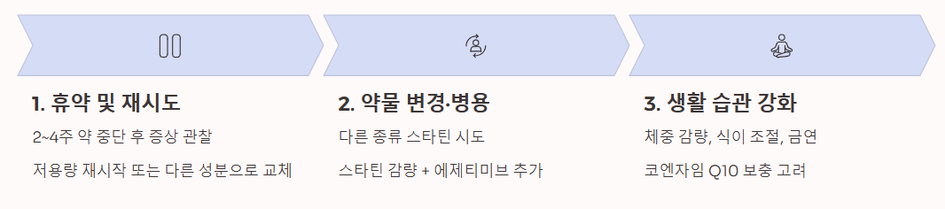 ① 휴약 및 재시도 (Wash-out & Re-challenge) 근육통이 심할 경우 의사와 상의하여 2~4주간 약을 끊고 증상이 사라지는지 관찰합니다. 증상이 사라지면 동일 성분의 저용량으로 다시 시작하거나 다른 성분의 스타틴으로 교체하여 반응을 살핍니다.