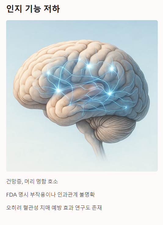 ② 인지 기능 저하 (기억력 감퇴) 일부 환자들은 약 복용 후 건망증이 심해졌다거나 머리가 멍하다고 호소합니다. 미국 FDA에서도 이를 드문 부작용으로 명시하고 있으나, 대규모 연구에서는 스타틴과 인지 기능 저하 사이의 직접적인 인과관계가 명확히 입증되지 않았습니다. 오히려 혈관을 깨끗하게 하여 혈관성 치매를 예방한다는 연구 결과도 있습니다. 고령 환자의 경우 노화에 의한 증상인지 약물 부작용인지 전문가의 감별이 필요합니다.