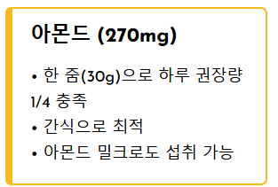 | 아몬드 | 약 270mg | 35g (약 한 줌 반) | 간식, 시리얼, 아몬드 밀크 |