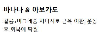 ⑥ 바나나 및 아보카도 (과일) 근육 이완에 시너지를 내는 칼륨과 마그네슘이 동시에 풍부합니다. 바나나는 운동 후 회복에 좋고, 아보카도는 건강한 지방도 함께 공급합니다.