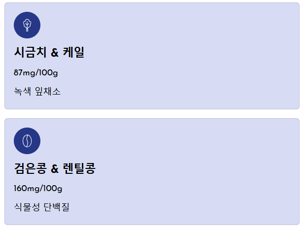 | 삶은 시금치 | 약 87mg | 120g (약 한 공기) | 나물, 된장국, 스무디 |