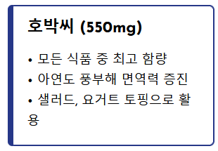 | 호박씨 | 약 550mg | 20g (약 2큰술) | 샐러드, 요거트 토핑 |