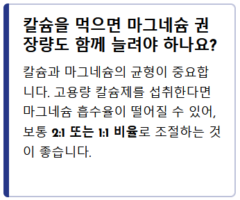 Q5. 칼슘을 먹으면 마그네슘 권장량도 함께 늘려야 하나요? 칼슘과 마그네슘의 균형이 중요합니다. 고용량 칼슘제를 섭취한다면 마그네슘 흡수율이 떨어질 수 있어, 보통 2:1 또는 1:1 비율로 마그네슘 섭취량을 조절하는 것이 좋습니다.
