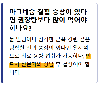 Q3. 마그네슘 결핍 증상이 있다면 권장량보다 많이 먹어야 하나요? 눈 떨림이나 심각한 근육 경련 같은 명확한 결핍 증상이 있다면, 일시적으로 치료 용량(권장량 이상)을 섭취할 수 있으나, 이 경우 반드시 전문가와 상담 후 섭취량을 결정해야 합니다.