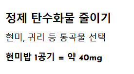 | 정제 탄수화물 줄이기 | 도정된 쌀 대신 현미, 귀리 등 통곡물 선택 | 현미밥 1공기 (약 40mg) |