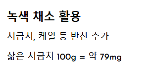 | 녹색 채소 활용 | 매일 식단에 시금치, 케일 등 녹색 채소 반찬 추가 | 삶은 시금치 100g (약 79mg) |