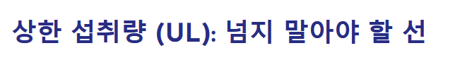 권장 섭취량보다 중요한 것이 바로 상한 섭취량(Tolerable Upper Intake Level, UL)입니다. 이는 건강에 유해한 영향이 나타나지 않는 하루 최대 섭취량입니다.