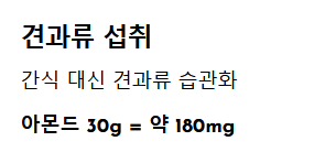 | 견과류 섭취 | 간식 대신 견과류 섭취 습관화 | 아몬드 약 30g (약 180mg) |