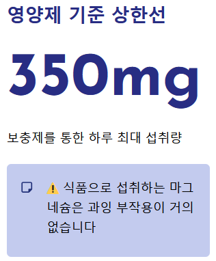 - 상한 섭취량 (영양제 기준): 일반적으로 350mg을 넘기지 않도록 주의 (음식 제외)