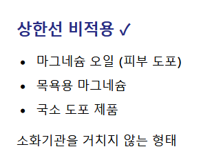 Q4. 권장량을 초과해도 되는 마그네슘 형태가 있나요? 일반적인 영양제는 상한선(350mg)이 적용되지만, 피부에 바르는 마그네슘 오일이나 목욕용 마그네슘은 소화기관을 거치지 않아 상한선 기준이 적용되지 않습니다.