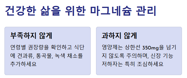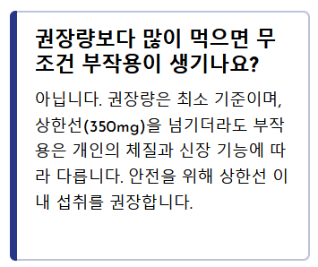 Q1. 권장량보다 많이 먹으면 무조건 부작용이 생기나요? 아닙니다. 권장량은 최소한의 기준이며, 상한선(350mg)을 넘기더라도 부작용은 개인의 체질과 신장 기능에 따라 다르게 나타납니다. 하지만 안전을 위해 상한선 이내로 섭취하는 것이 좋습니다.