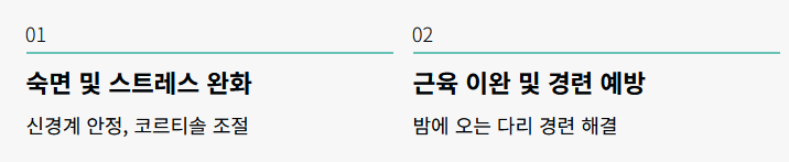 - 숙면 및 스트레스 완화: 신경계를 안정시켜 수면의 질을 높이고, 스트레스 호르몬인 코르티솔 분비를 조절합니다.