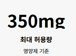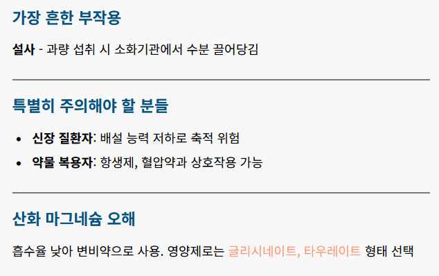 | 최대 허용량 | 350mg/일 (영양제 기준) | 과다 섭취 시 설사 등 부작용 발생 가능 |
