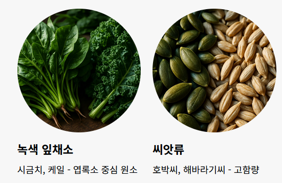 - 시금치, 케일 등 녹색 잎채소: 엽록소의 중심 원소로 마그네슘 함량이 높습니다.