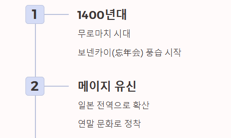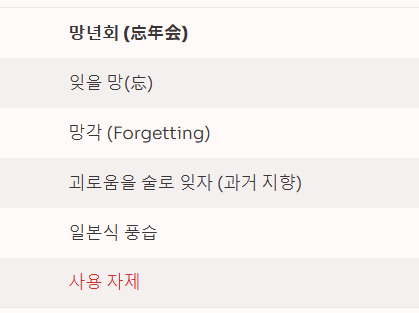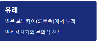 - 유래: 일본의 연말 풍습인 보넨카이(Bōnenkai)에서 비롯된 일제강점기의 잔재입니다.