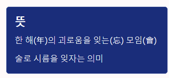 - 뜻: 한 해(年)의 괴로움을 잊는(忘) 모임(會)이라는 뜻으로, 술을 마시며 시름을 잊자는 의미가 강합니다.