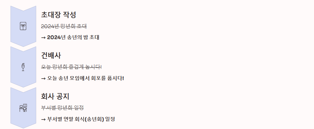 - 초대장 작성 시: 2024년 망년회 초대 (X) → 2024년 송년의 밤 초대 (O)