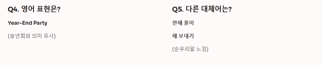 Q5. 다른 대체어는 없나요? 송년회 외에도 순우리말 느낌을 살려 한해 풀이, 해 보내기 등으로 표현하기도 합니다.