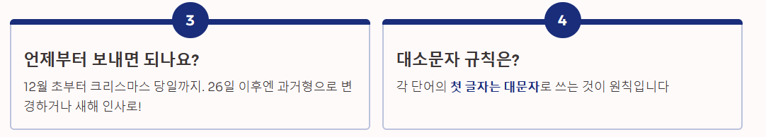 - Merry Christmas, Happy Holidays처럼 각 단어의 첫 글자는 대문자로 쓰는 것이 원칙입니다.