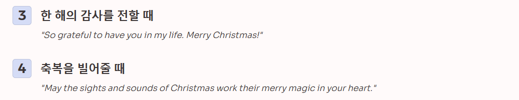 - 보통 12월 초부터 크리스마스 당일까지 자유롭게 사용합니다. 12월 26일 이후에는 "Hope you had a wonderful Christmas(멋진 크리스마스 보냈길 바래)"라고 과거형으로 인사를 건네거나, "Happy New Year"로 넘어가면 됩니다.