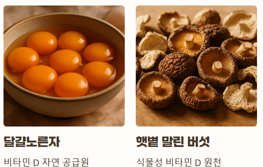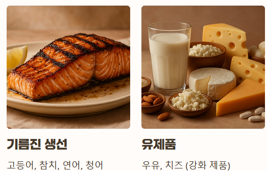 - 유제품: 우유, 치즈 (비타민 D 강화 제품 확인)