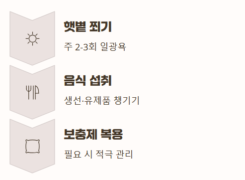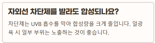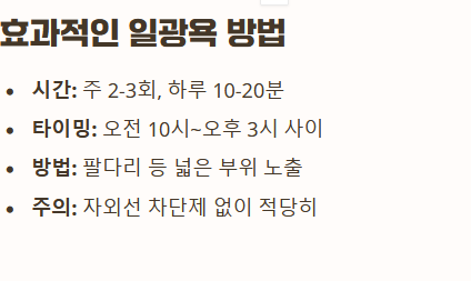 - 방법: 자외선 차단제를 바르지 않은 상태로 팔이나 다리 등 넓은 피부 면적을 노출해야 효과적입니다. (단, 과도한 자외선 노출은 피해야 합니다.)