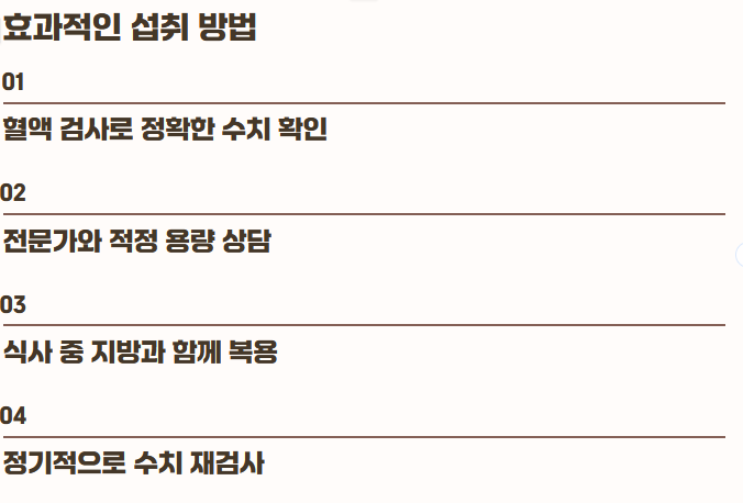 - 전문가 상담: 정확한 복용량은 반드시 혈중 수치 검사 후 의사나 약사와 상의하여 결정해야 합니다.