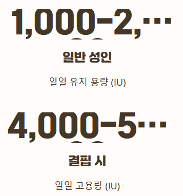 - 권장량: 일반 성인의 유지 용량은 보통 일일 1,0002,000 IU 정도이며, 결핍 상태라면 4,000-5,000 IU와 같은 고용량을 복용해야 할 수 있습니다.