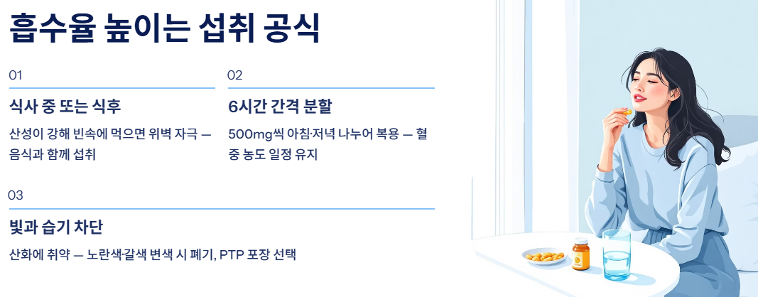 ① 반드시 '식사 중'이나 '식후'에 드세요 비타민C는 산성이 강해 빈속에 먹으면 위벽을 자극해 속이 쓰릴 수 있습니다. 음식물과 섞여 들어가야 위장 장애도 줄고 흡수율도 높아집니다. 위장이 약하다면 식사 중간에 드시는 것을 추천합니다.