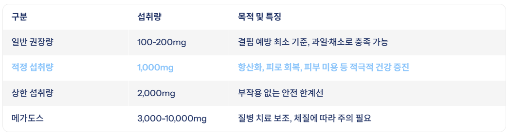 | 적정 섭취량 | 1,000mg (1g) | 항산화, 피로 회복, 피부 미용 등 적극적인 건강 증진을 위한 용량. |