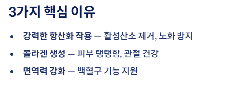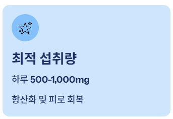 - 최적 섭취량: 하루 500mg ~ 1,000mg (항산화 및 피로 회복 효과)
