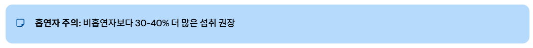 참고: 흡연자는 비흡연자보다 비타민C 소모량이 훨씬 많으므로, 일반 권장량보다 30~40% 더 많이 섭취하는 것이 좋습니다.